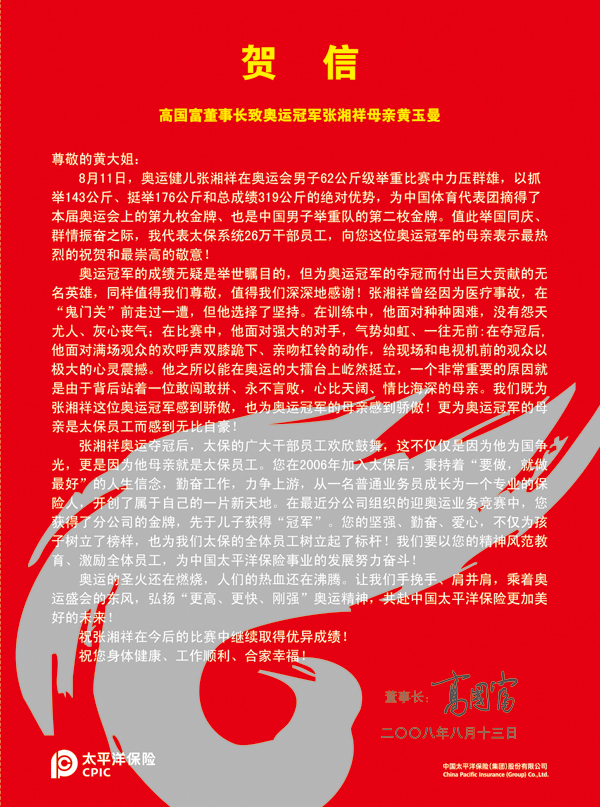 高國富董事長致信奧運(yùn)冠軍張湘祥母親 返回列表頁>>
