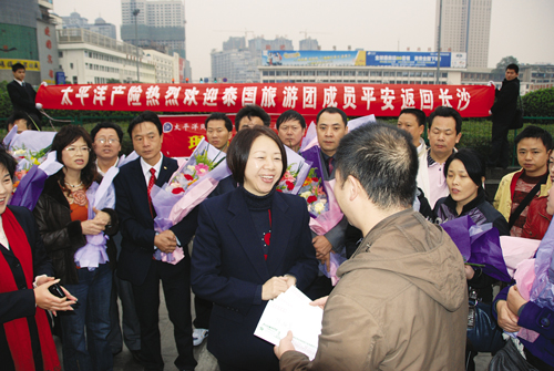 滯留泰國的游客送上鮮花,同時,根據之前湖南新康輝國際旅行社與太保產險湖南岳麓支公司簽訂的保險團購合同旅行社責任險條款,他們向每一位返鄉的游客送上