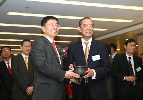 高國富代表公司向香港聯交所主席夏佳理贈送上市紀念品——代表誠信的“中國用戶滿意鼎”(珍藏版)。