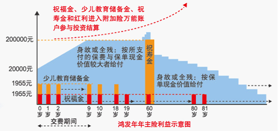 “年動力”方面,客戶每年可獲得年金和紅利金。年金為固定收益,包括祝福金(領取至終身)和少兒教育儲備金(被保險人0-18周歲期間領取),金額分別為基本保額的9%。即若為未成年人投保,被保險人0-18周歲期間,每年的年金領取額為基本保額的18%,18周歲后至終身每年的年金領取額為基本保額的9%。首期年金在保單生效后即可領取,利益即得,無需等待。紅利金(紅利是不確定的)是指每年可參與公司紅利分配,分享公司經營成果。祝福金和紅利金均為年年領取至終身。
