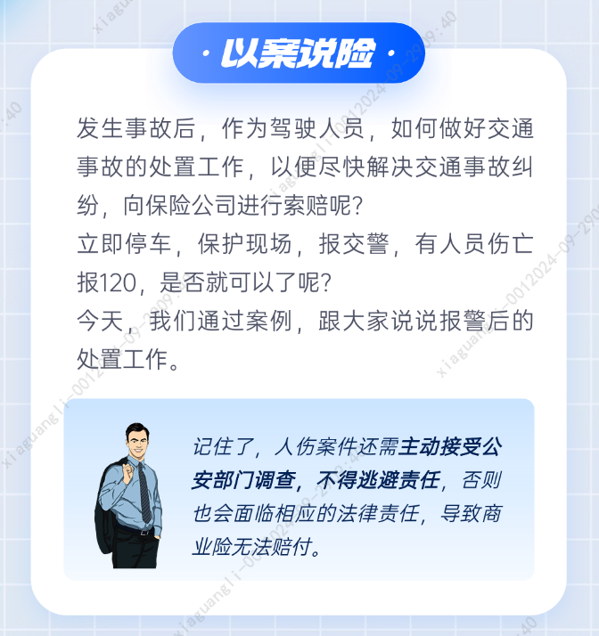 事故發生后,作為駕駛人員應及時報警,配合搶救傷者,積極主動配合交警進行調查和處理,到交警隊提供相關證據和信息,不得逃避調查,若逃避、不配合公安部門調查也將構成肇事逃逸,若駕駛人有交通肇事逃逸的情形,屬于商業險責任免除范圍內。