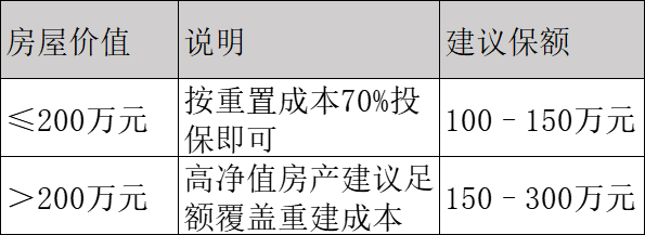 房屋主體保額按市場估值設定,通常為房產總價的60%-80%,新房可按購房價投保;