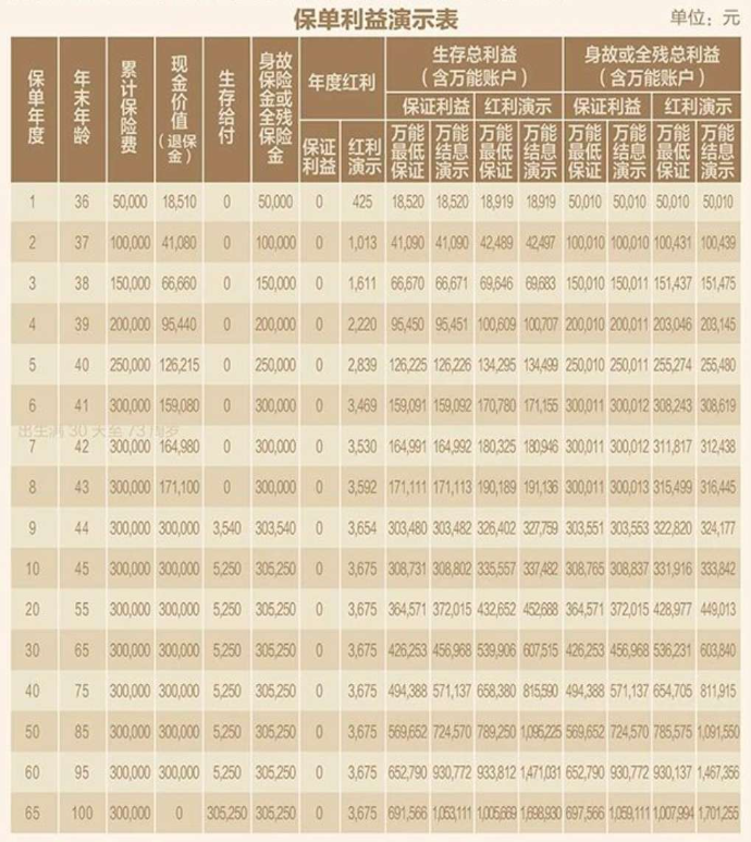 注:1.紅利分配分別按保證利益、紅利演示2種情況進(jìn)行預(yù)測,僅作為參考之用。紅利演示不作為未來紅利分配的保證,實際紅利水平可能高于或低于表中所列數(shù)字;2.為了便于說明,假定合同生效日為1月1日;3.累積紅利的累積利率為1.75%,是假設(shè)值,公司每年公布的累積利率可能高于或低于該利率;4.以上演示的被保險人年齡、生存給付(包含祝福金、滿期金)為保單年度末且經(jīng)過完整保單年度的值;5.現(xiàn)金價值(退保金)、身故保險金為保單年度末且經(jīng)過品整保單年度的值,保單年度中的現(xiàn)金價值(退保金)、身故保險金可能高于或低于該數(shù)值,現(xiàn)金價值(退保金)不包含當(dāng)年給付的祝福金及滿明保險金;6.萬能賬戶價值按照假設(shè)的結(jié)算利率計算,最低保證、結(jié)息演示兩檔的結(jié)算利率假設(shè)分別為1.0%(最低保證利率)、3.0%,萬能臉的最低保證利率之上的投資收益是不確定的,實際保單賬戶利益可能低于萬能結(jié)息利益演示水平;7.合同生效日對應(yīng)日派發(fā)的相關(guān)利益計入上一保單年度末;8.演示數(shù)據(jù)保留整數(shù)。